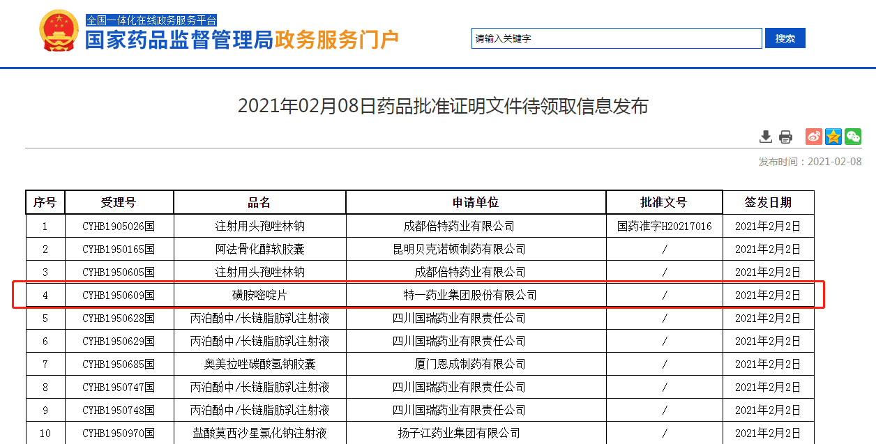 近日,國家藥品監(jiān)督管理局正式發(fā)布通知,特一藥業(yè)集團(tuán)有限公司申報的磺胺嘧啶片正式通過仿制藥質(zhì)量和療效一致性評價。同時,這也是國內(nèi)首家通過磺胺嘧啶片的企業(yè)。